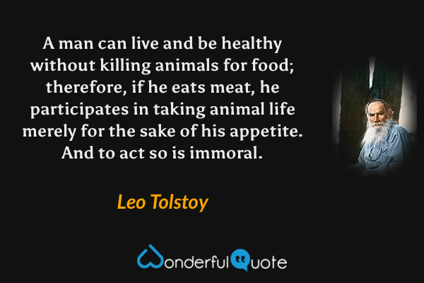 A man can live and be healthy without killing animals for food; therefore, if he eats meat, he participates in taking animal life merely for the sake of his appetite. And to act so is immoral.