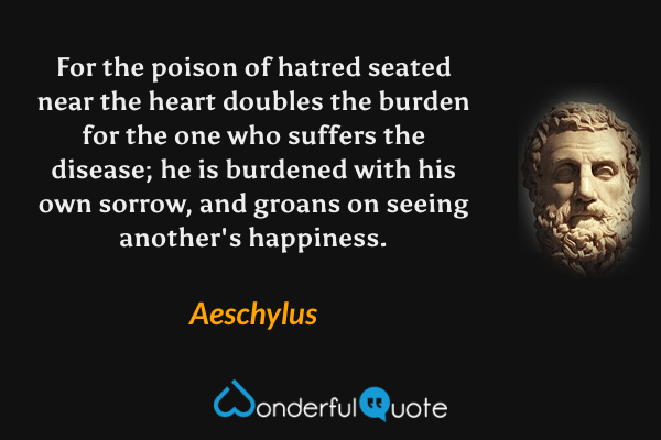 For the poison of hatred seated near the heart doubles the burden for the one who suffers the disease; he is burdened with his own sorrow, and groans on seeing another's happiness.