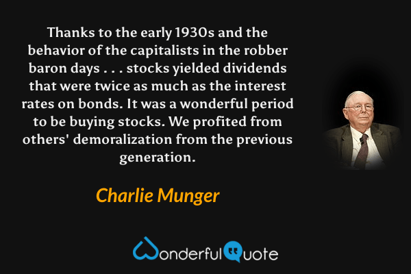 Thanks to the early 1930s and the behavior of the capitalists in the robber baron days . . . stocks yielded dividends that were twice as much as the interest rates on bonds. It was a wonderful period to be buying stocks. We profited from others' demoralization from the previous generation.