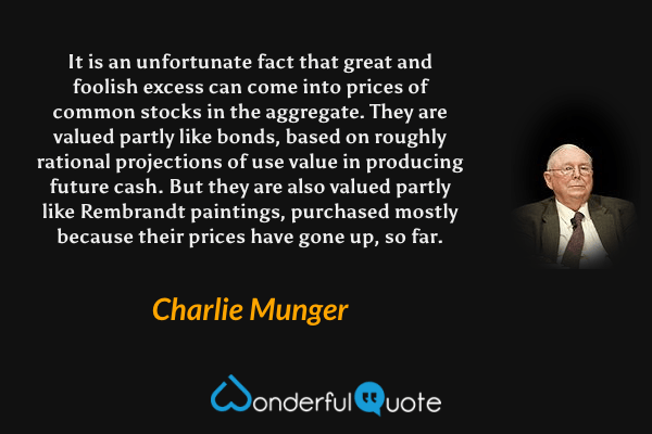It is an unfortunate fact that great and foolish excess can come into prices of common stocks in the aggregate. They are valued partly like bonds, based on roughly rational projections of use value in producing future cash. But they are also valued partly like Rembrandt paintings, purchased mostly because their prices have gone up, so far.