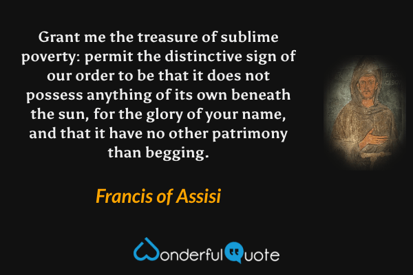 Grant me the treasure of sublime poverty: permit the distinctive sign of our order to be that it does not possess anything of its own beneath the sun, for the glory of your name, and that it have no other patrimony than begging.